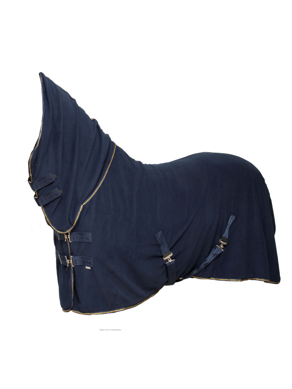 Kvaliteetne antipilling-fliis täiskaelaga, ääristel kuldsed dekoratsioonid. Reguleeritav esikinnitus T-pandlatega, reguleeritavad ristuvad kõhualused rihmad ning sabarihm.